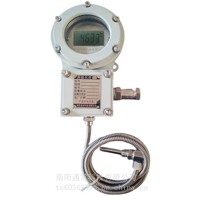 TC1001自供电测温仪表/防爆数字测温表/防爆数字远传测温表是一款拥有多项知识产权的现场在线防爆测温仪表,该仪表从温度显示部分的防爆金属外壳选取、电路板的设计、元器件的甄别、程序的编写到软件的开发,都几乎做到精益求精。采用大视窗、***功耗、自供电方式、10年超长在线监测,无需外接电源,LCD显示,形式品种多样,能适用各种现场使用。产品结构合理、精度高、性能稳,实现仪表智能化。TC1001自供电测温仪表/防爆数字测温表/防爆数字远传测温表按照GB3836.1-2010《爆炸性环境***部分:设备通用要求》和GB3836.2-2010《爆炸性环境第2部分:由隔爆外壳“d”保护的设备》设计制造的防爆型产品,专一用于除煤矿外的其它爆炸性气体环境场合,可对爆炸性环境、机械、工业设备、仓库、冷库、以及管道或容器介质进行温度测量,既可现场显示又可远传Pt100热电阻信号、4~20mA电流信号、RS485信号,可与控制室计算机连接或控制单元连接,进行有效控制或信息存储,既减轻劳动强度又提高了劳动效率;既减少了意外事故发生又增强了安全性。应用广泛,可用于石油、化工、医药、船舶、炼钢、电力、天然气等易燃易爆场所;尤其对电机轴瓦测温更适合,因为专一为电机轴瓦测温而设计!是一款非常理想的现场高精度测量仪表。