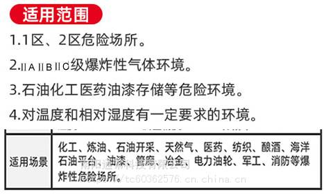 1、适用场所:含有ⅡA、ⅡB、ⅡC级6组爆炸性气体混合物1区、2区场所。